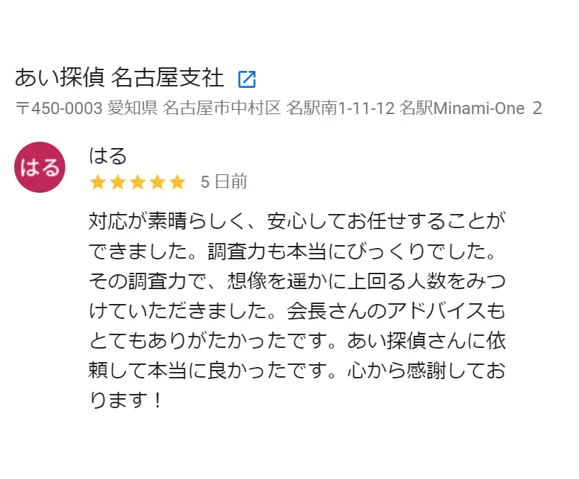 私も、依頼者の方で、素人では調査能力に限界のある場合、迷わず「あい探偵」をお勧めしております。